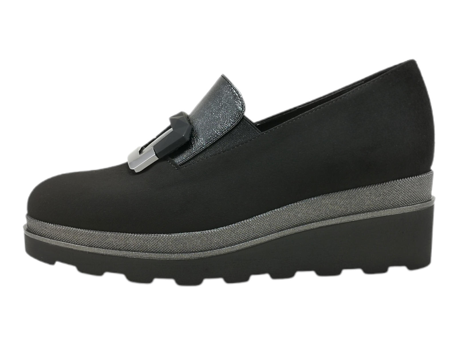 I Mocassini Donna CINZIA Soft MM855325, disponibili su Laporta Calzature, sono l’alleato perfetto per un look raffinato, ma senza rinunciare alla comodità. Realizzati in scamosciato nero con un inserto laminato brillante, sono impreziositi da un grazioso accessorio stilizzato che dona un tocco di eleganza. Il plantare imbottito in pelle ti coccolerà tutto il giorno, mentre la zeppa di 5 cm in poliuretano leggero con effetto ammortizzante ti regalerà quel pizzico di altezza senza sacrificare il comfort. Ideali per l’ufficio o una serata fuori, questi mocassini sono talmente versatili che ti accompagneranno in ogni momento della giornata. Cosa aspetti? Metti un po' di glamour ai tuoi piedi e acquista ora su Laporta Calzature!