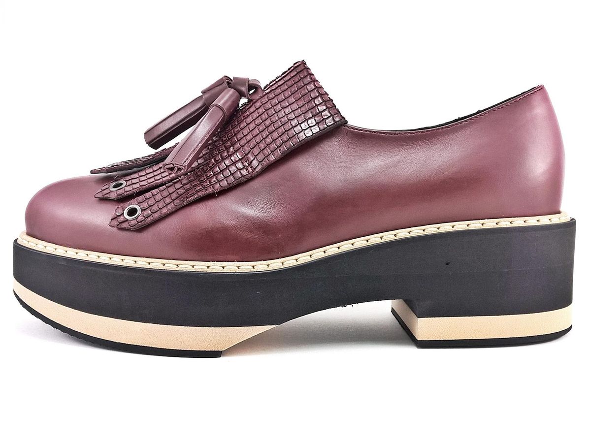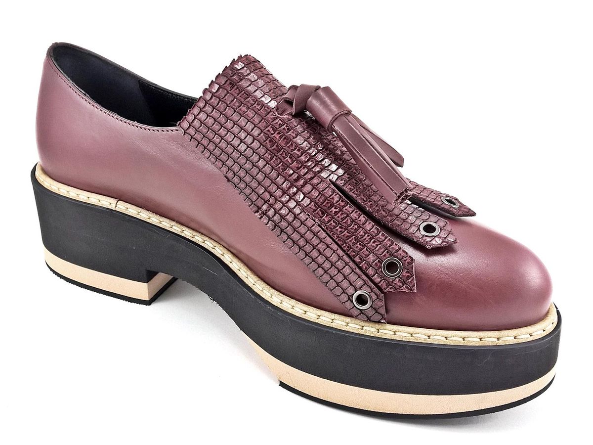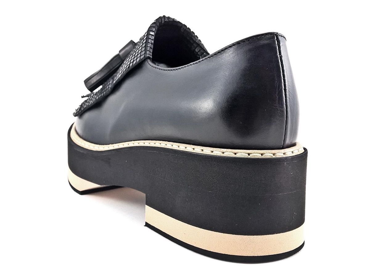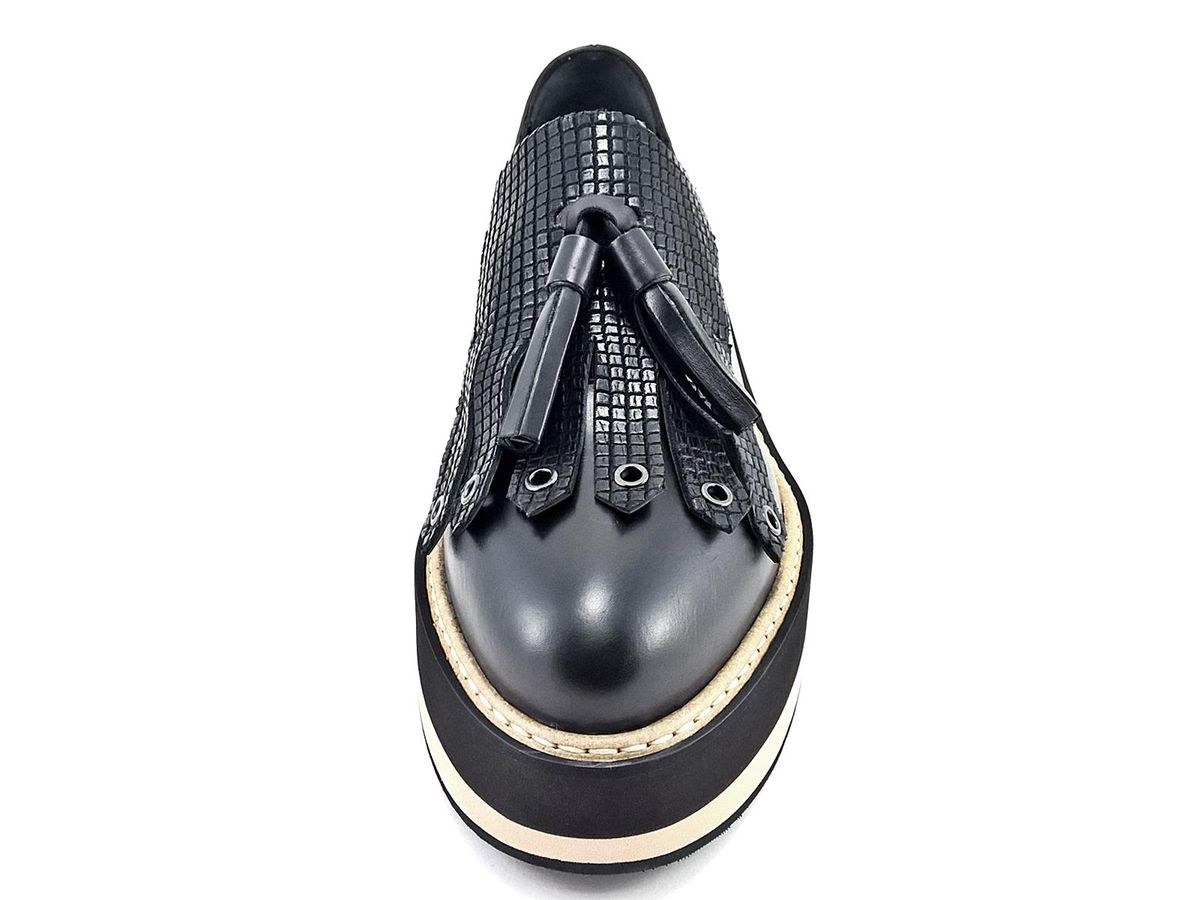SLIP ON REALIZZATO INTERAMENTE IN PELLE CON FRANGIA E NAPPINE IN PELLE STAMPATA A RILIEVO, FODERA E SOTTOPIEDE IN PELLE, FONDO IN MICRO ULTRALEGGERO BICOLORE CON TACCO DI 5 cm E PLATEAU DI 3,5 cm.