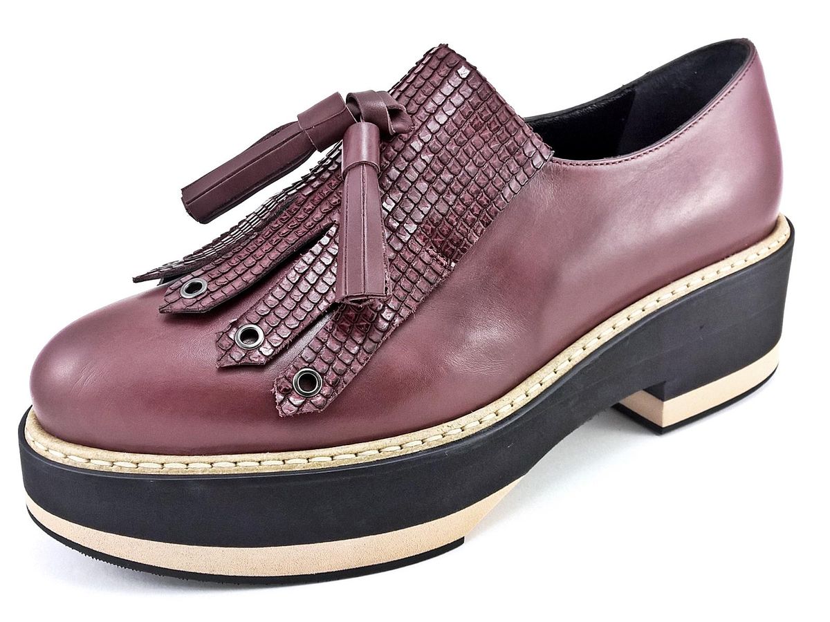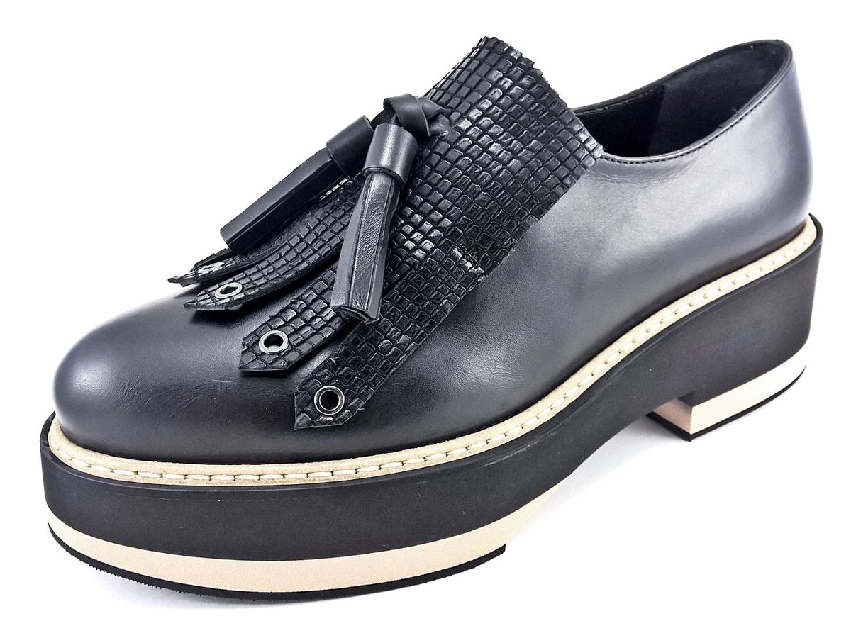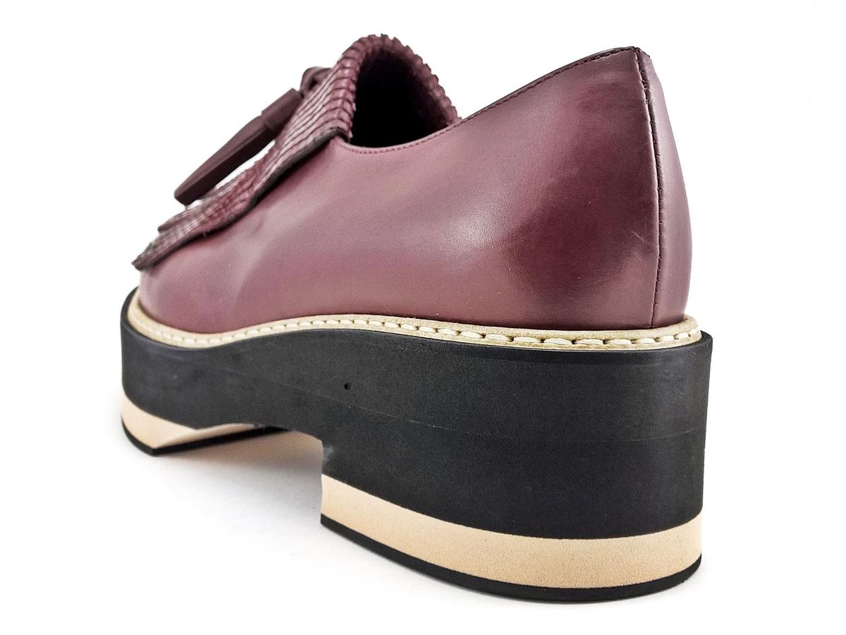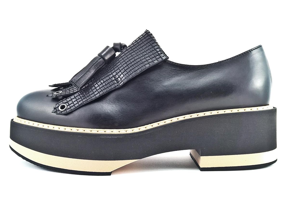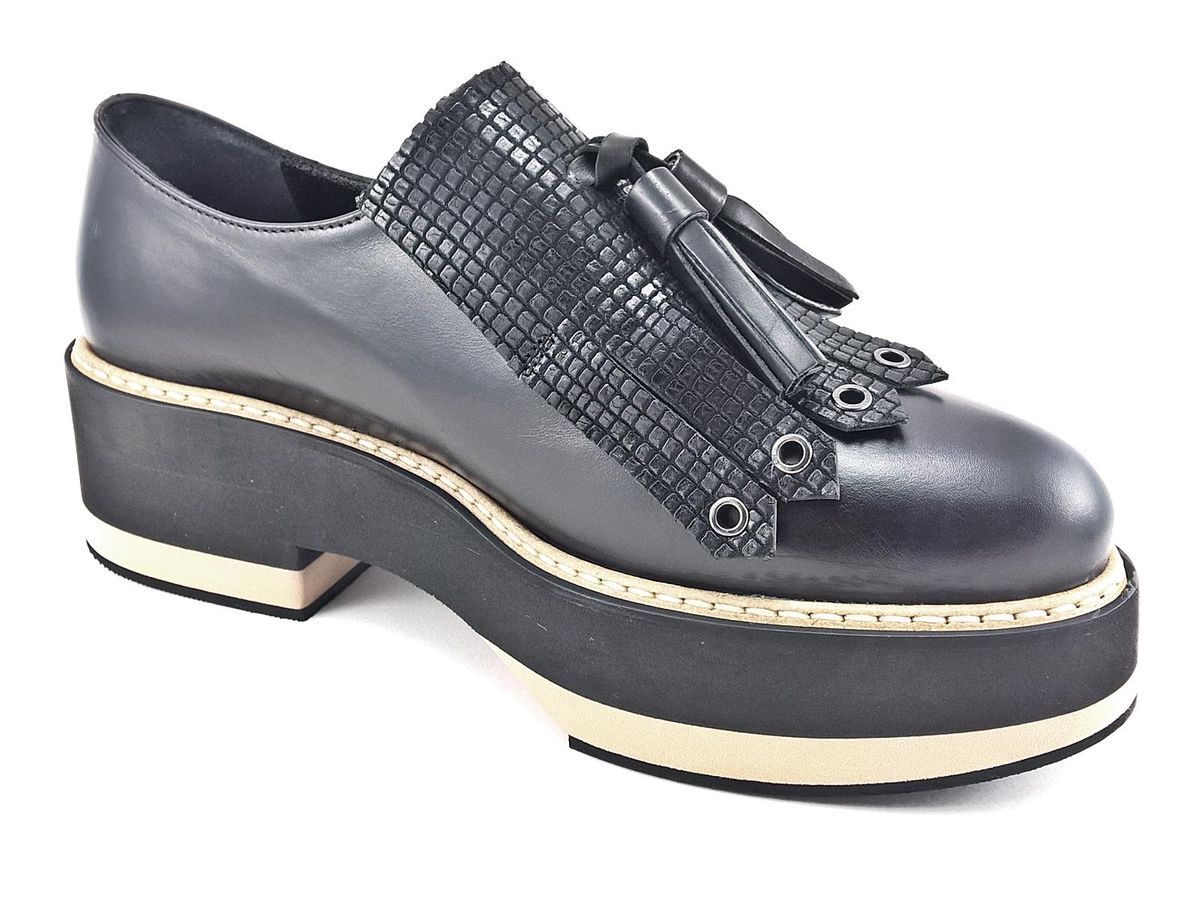 SLIP ON REALIZZATO INTERAMENTE IN PELLE CON FRANGIA E NAPPINE IN PELLE STAMPATA A RILIEVO, FODERA E SOTTOPIEDE IN PELLE, FONDO IN MICRO ULTRALEGGERO BICOLORE CON TACCO DI 5 cm E PLATEAU DI 3,5 cm.