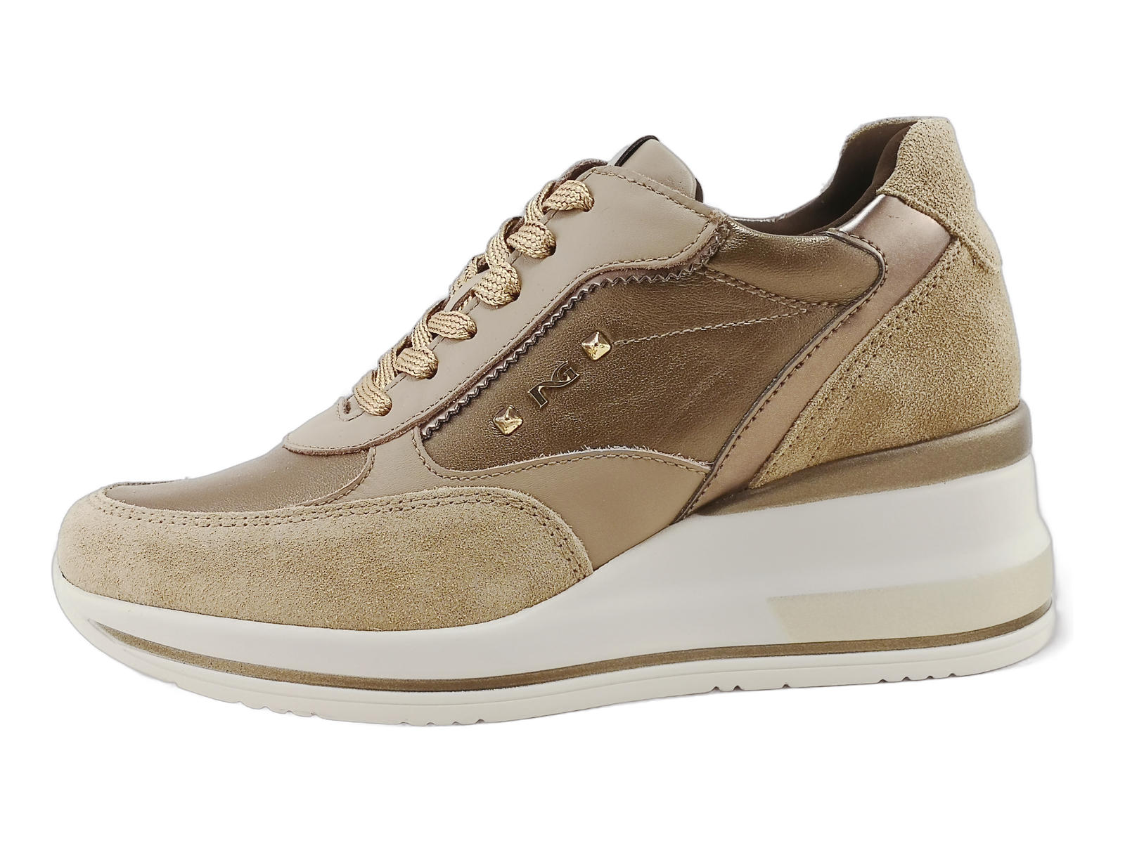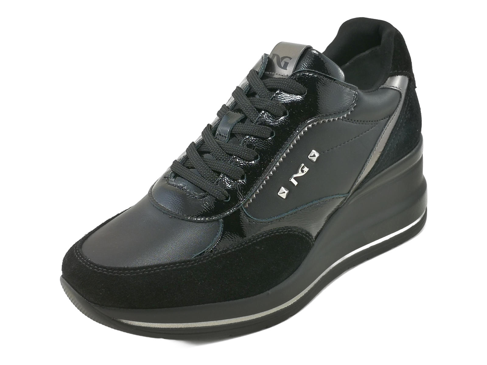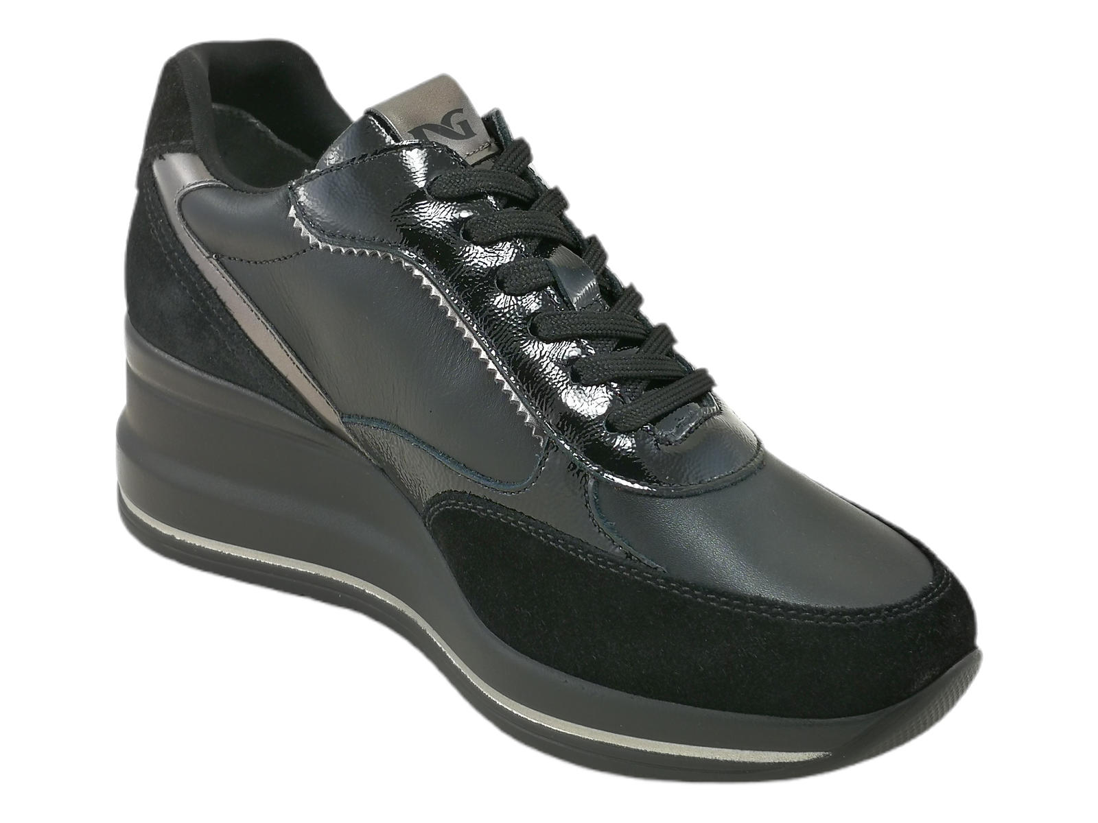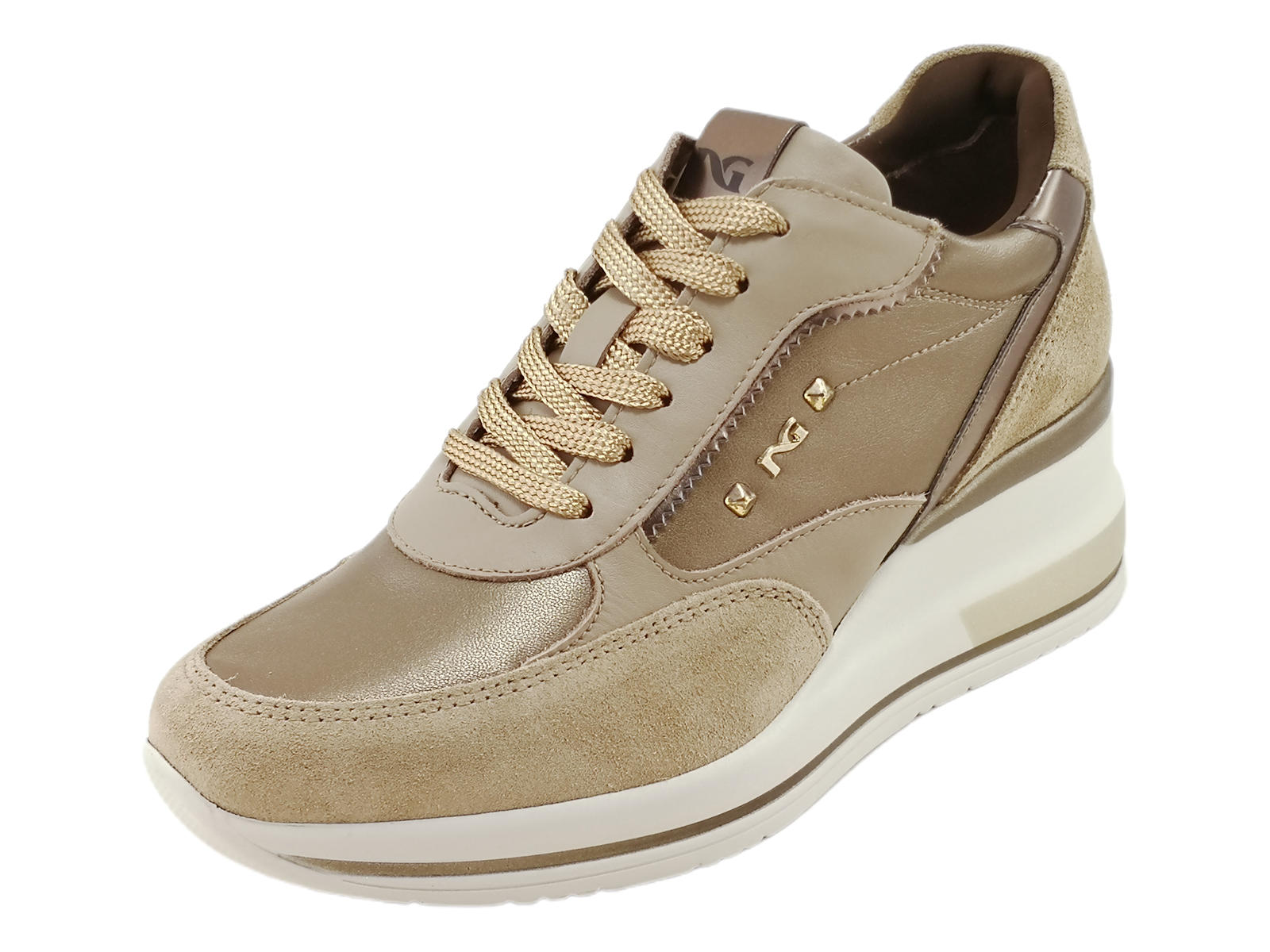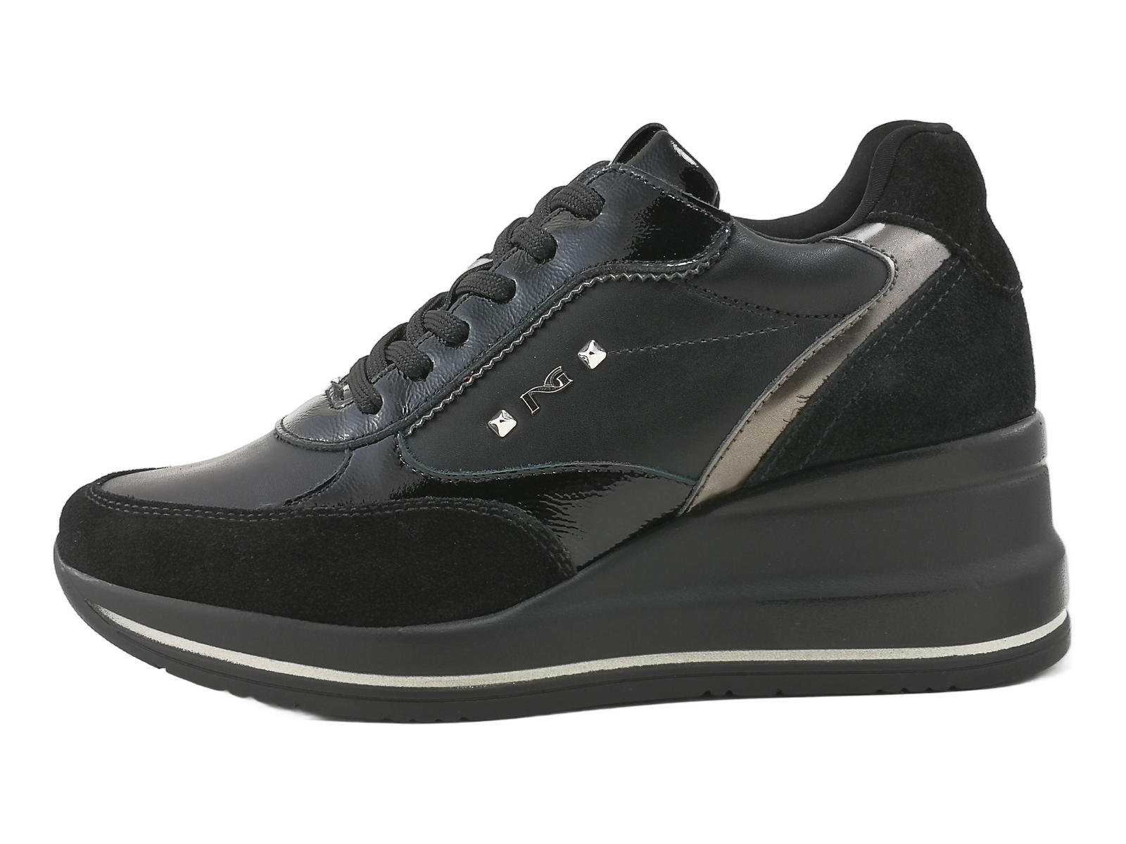 Le sneakers donna NeroGiardini I514130D sono il perfetto equilibrio tra comfort e stile. Realizzate in un mix raffinato di pelle, camoscio e laminato, aggiungono un tocco chic anche al look più casual.