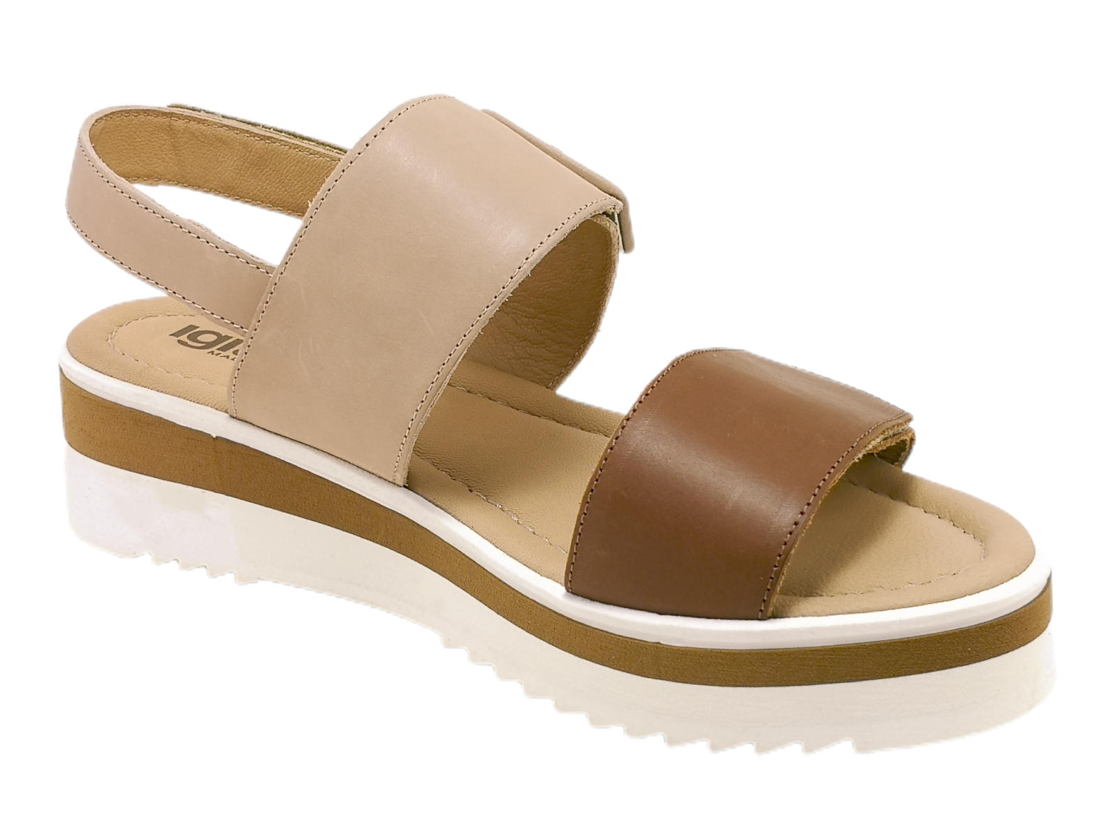Eleva il tuo stile con questo sandalo zeppa da donna di Igi&Co 3686222. Realizzato in Italia con pelle di alta qualità, offre comfort e versatilità. Le due fasce bicolore regolabili con strappo e il cinturino posteriore con chiusura velcro garantiscono una calzata perfetta. Il sottopiede imbottito in pelle offre un comfort extra, mentre la zeppa di 4 cm in gomma ti permette di camminare con sicurezza. Aggiungi un tocco di eleganza made in Italy al tuo guardaroba con questo sandalo.