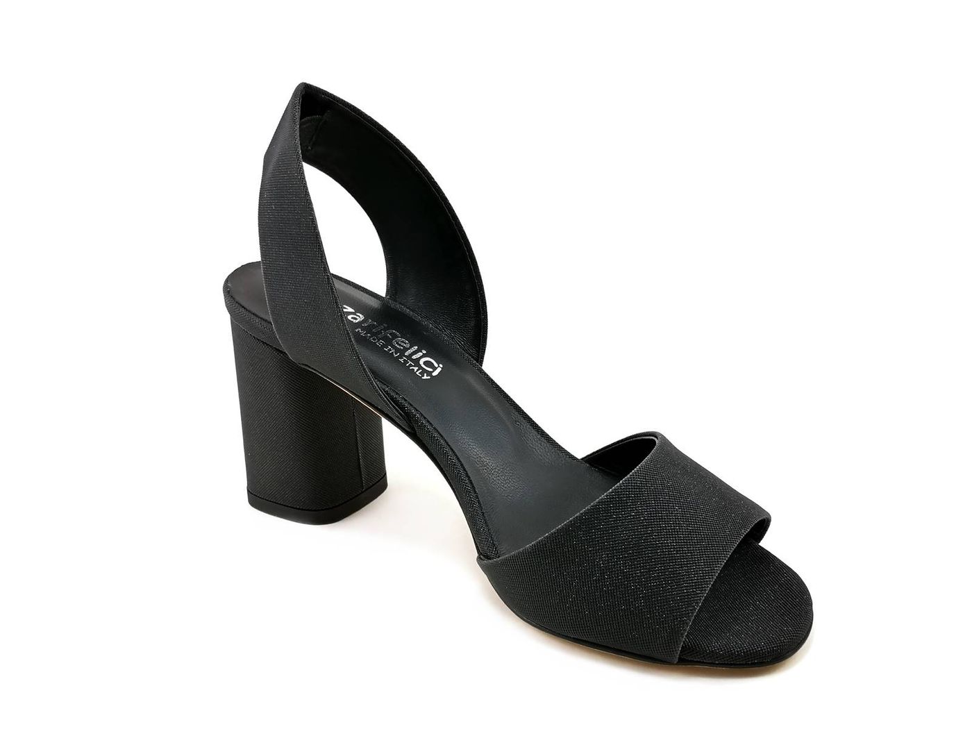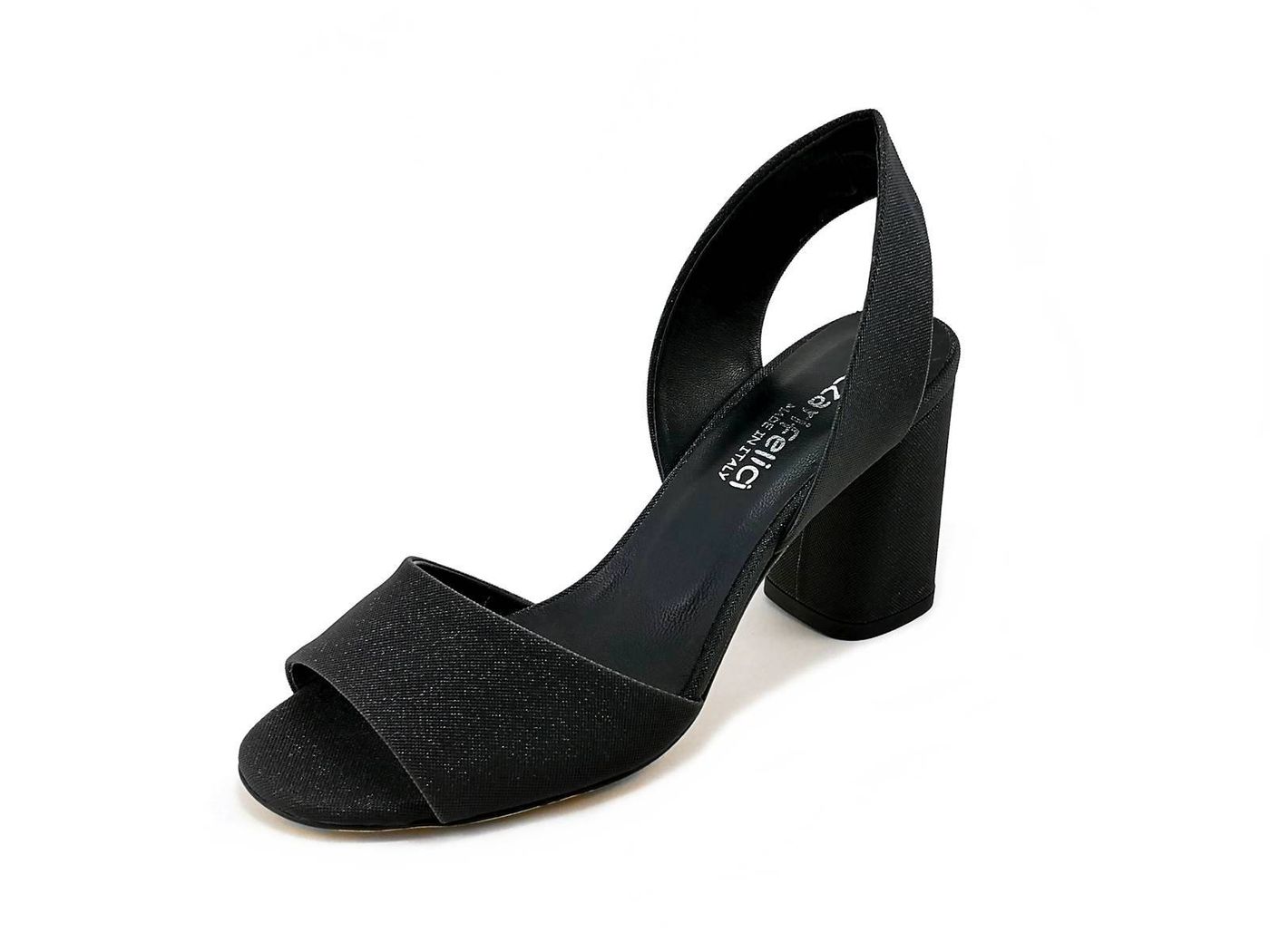 Descrizione: Sandali con tacco Lazzarifelici 1988/Ida - Sandali spuntati slingback eleganti in tessuto glitter brillante, fodera e sottopiede in pelle, tacco a blocco rivestito in glitter di 7,5 cm. Suola in Vero Cuoio. Made in Italy.