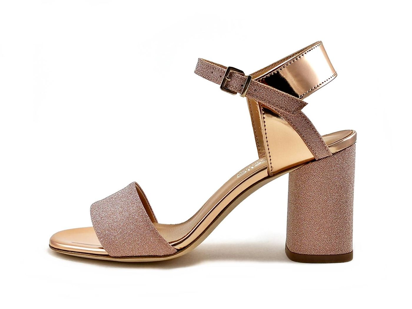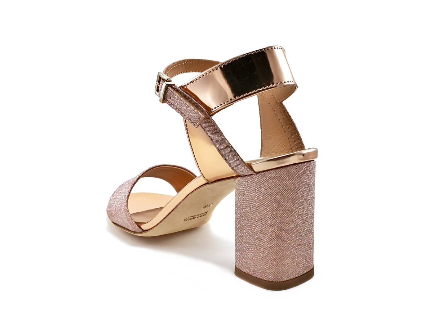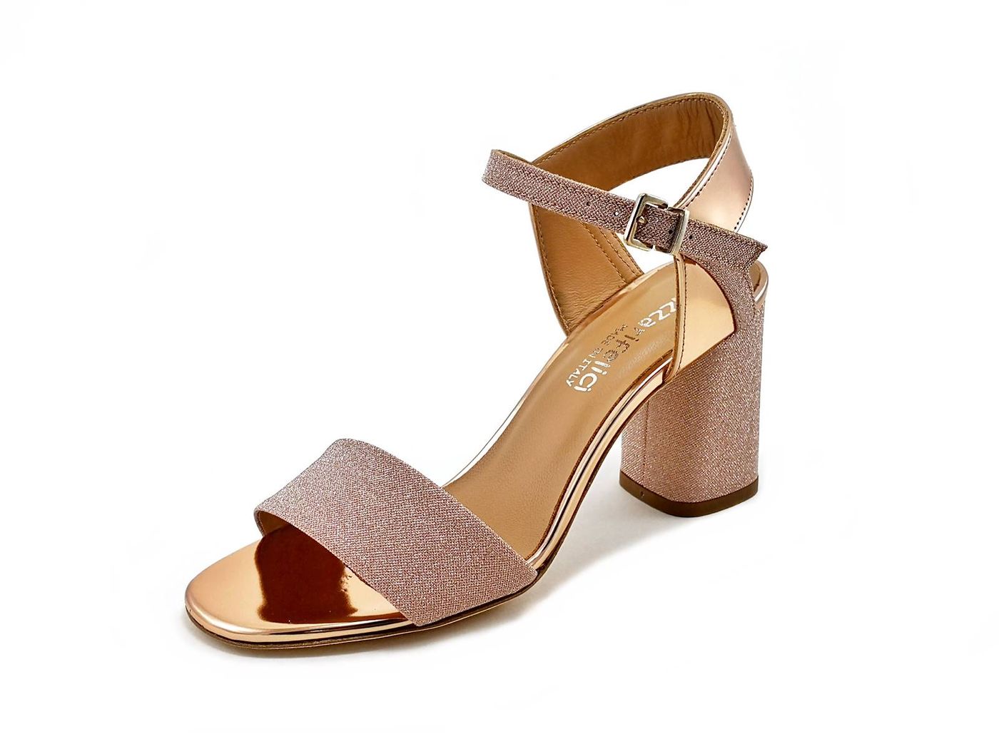 Descrizione: Sandali con tacco Lazzarifelici 2033/Ida - Sandali eleganti in tessuto glitter brillante e pelle mirror, fodera e sottopiede in pelle, tacco a blocco rivestito in glitter di 7,5 cm. Suola in Vero Cuoio. Made in Italy.