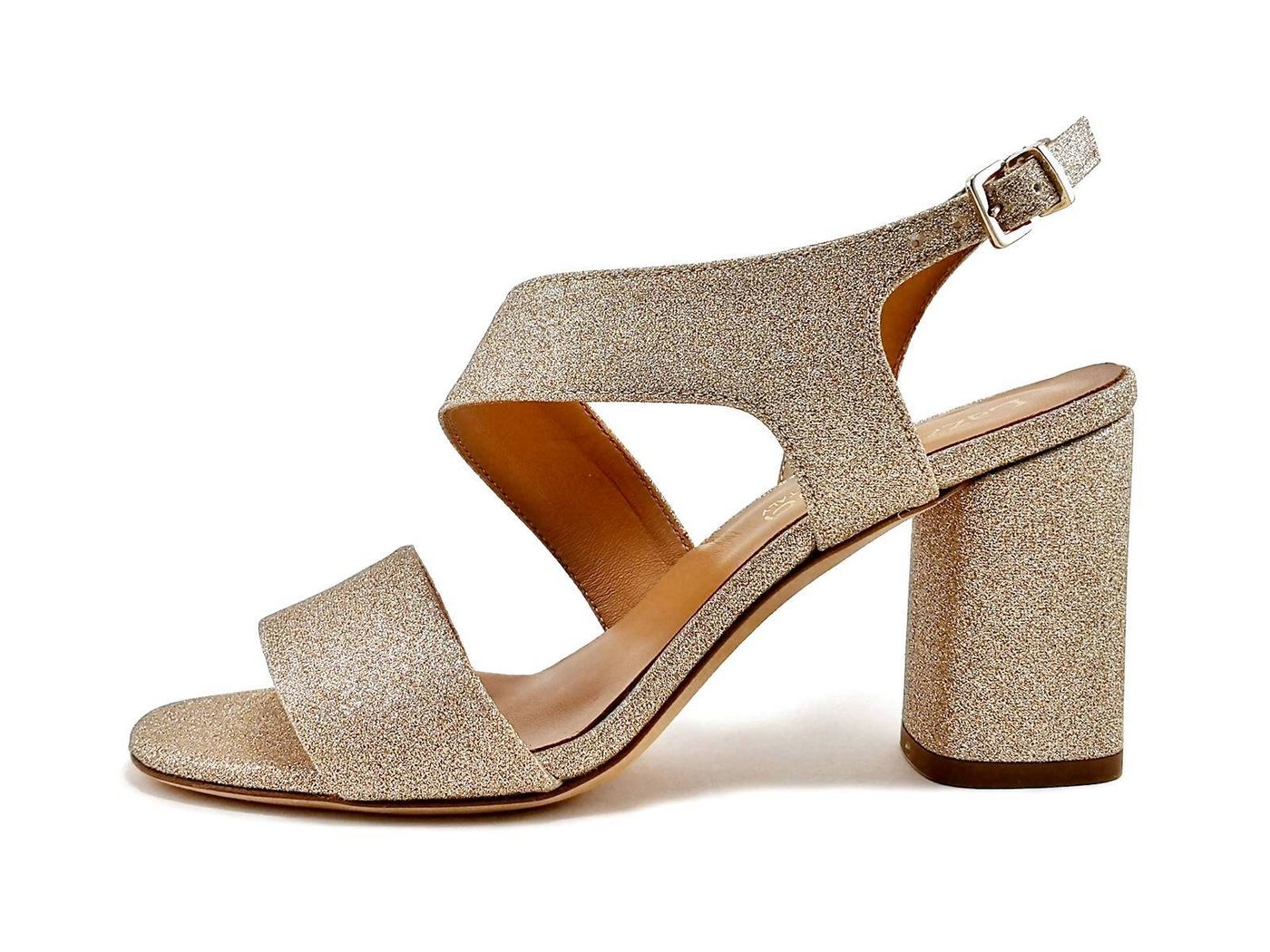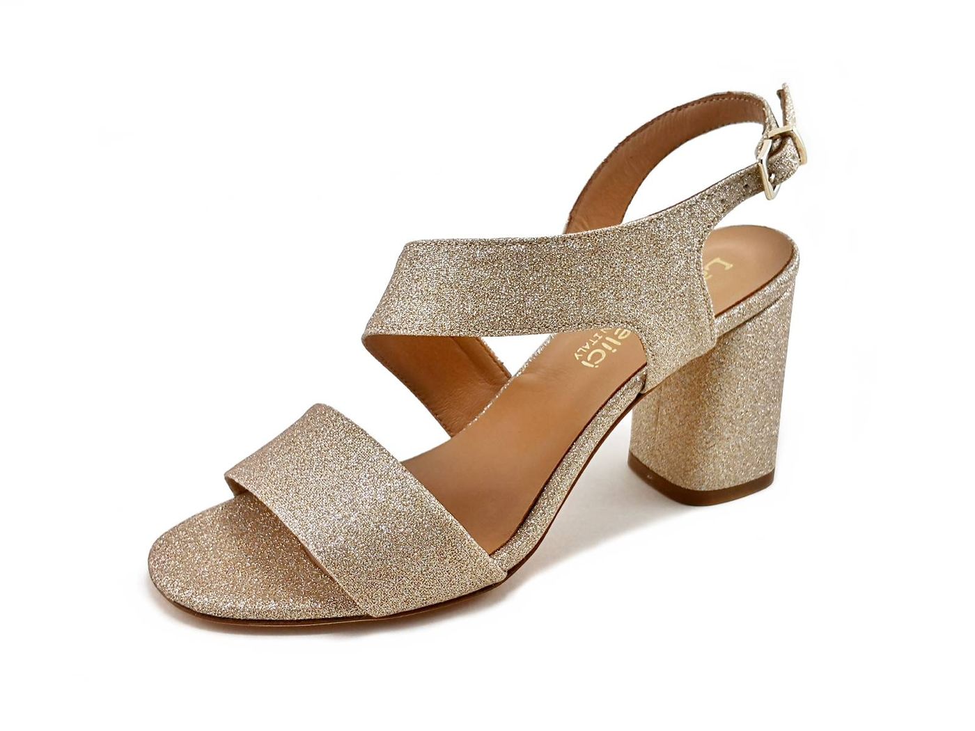 Descrizione: Sandali con tacco Lazzarifelici 2661/Ida - Sandali con fascia trasversale eleganti in tessuto glitter brillante, fodera e sottopiede in pelle, tacco a blocco rivestito in glitter di 7,5 cm. Suola in Vero Cuoio. Made in Italy.