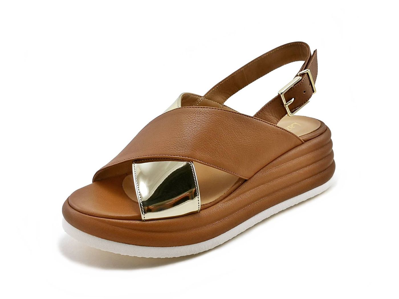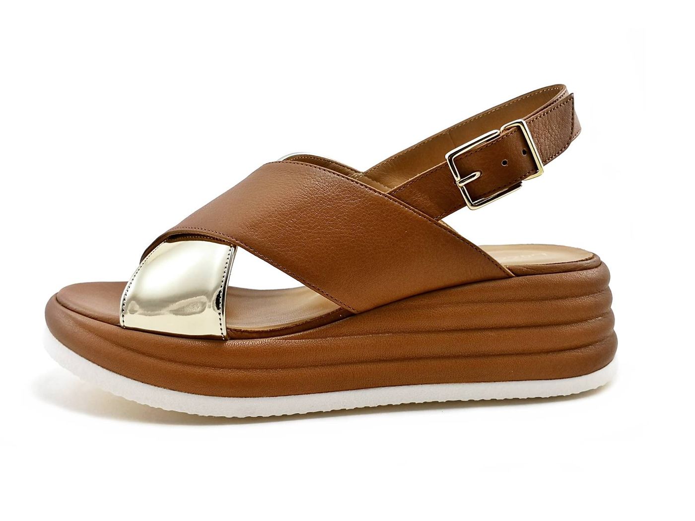 Descrizione: Sandalo zeppa Lazzarifelici 2951/Jan - Sandali con fasce incrociate di pelle e specchio oro e maxi fibbia metal dorata, fodera e sottopiede in pelle. Fondo zeppa rivestito in pelle di 4,5 cm con suola in gomma. Made in Italy.