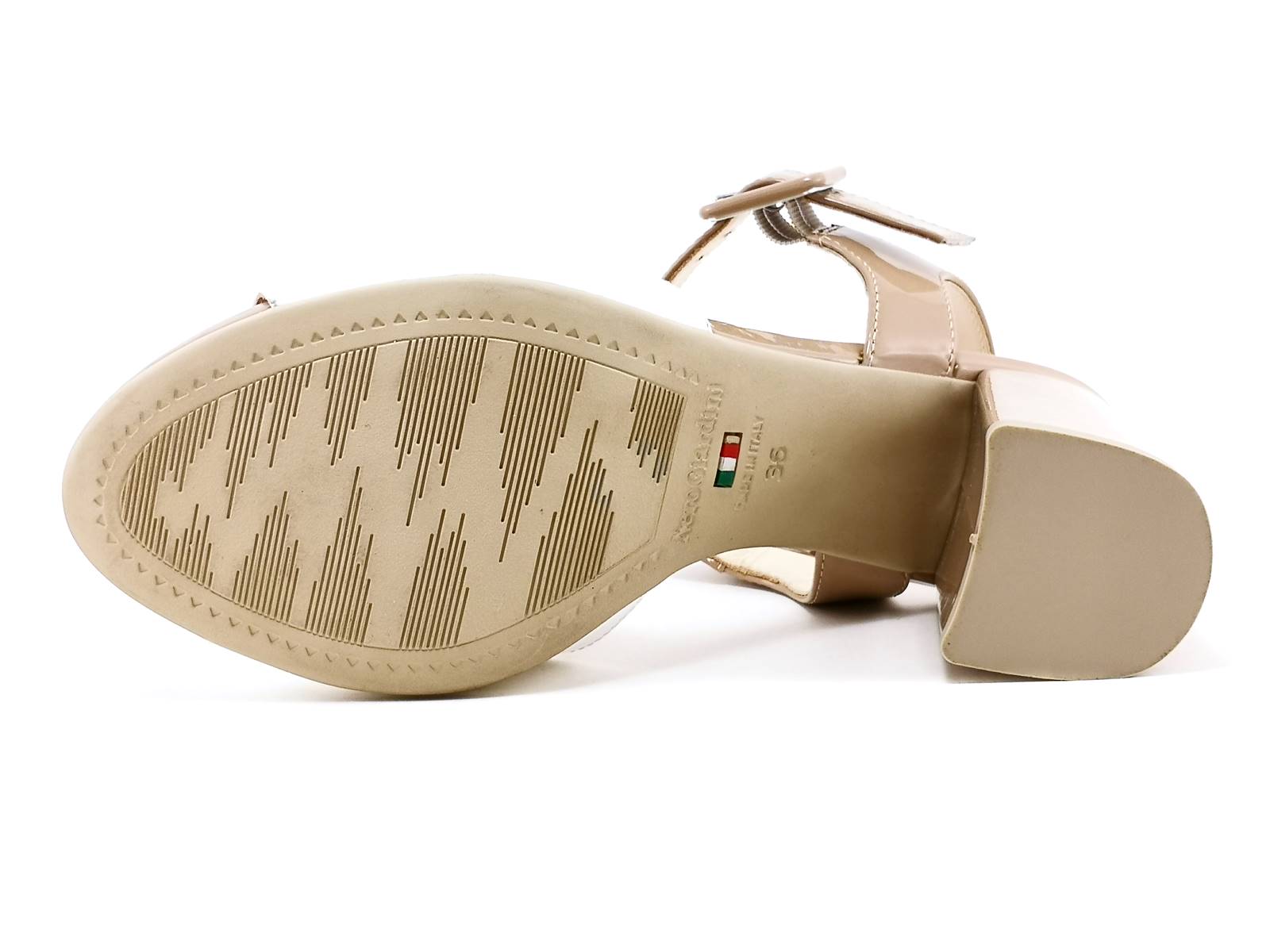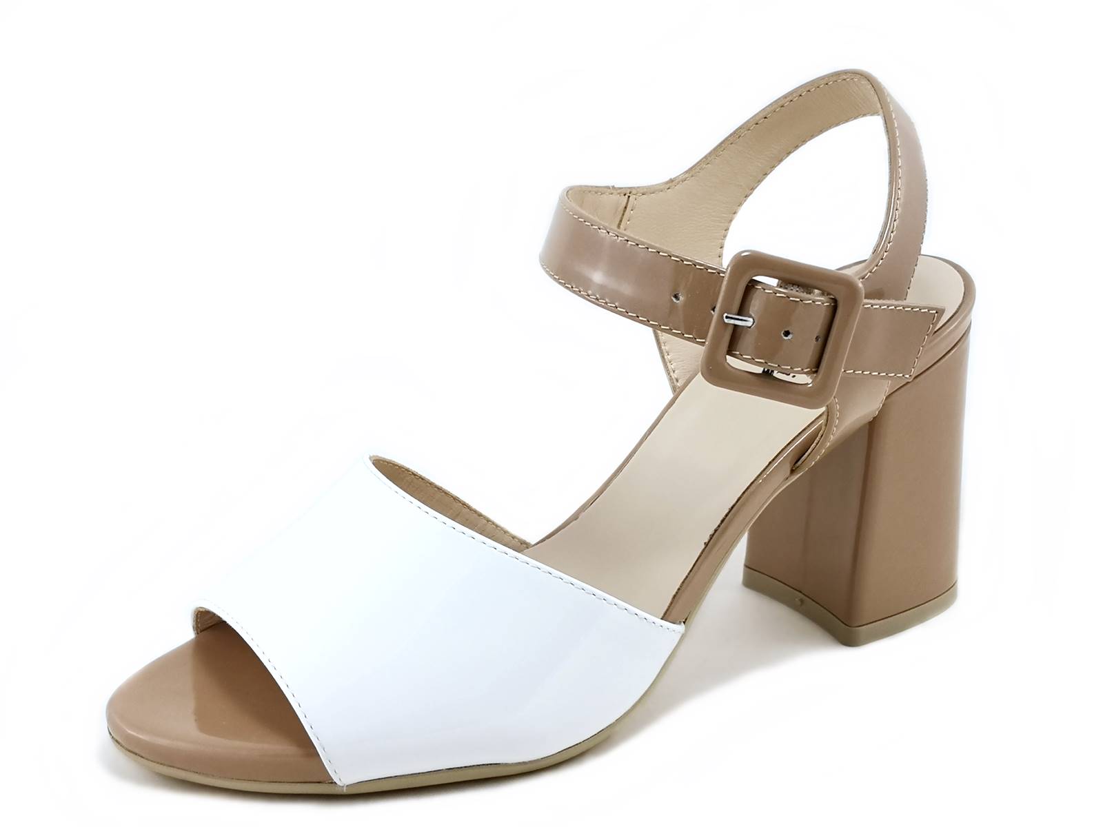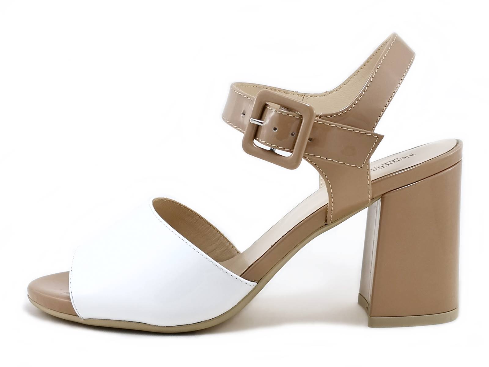 Descrizione: Il sandalo con tacco NeroGiardini E218420DE è un'elegante calzatura in naplak bicolore e fodera in pelle con cinturino alla caviglia e chiusura regolabile con fibbia. Il tacco misura 7,5 cm ed è dotato di sottopiede imbottito in pelle per garantire la massima comodità. La suola in gomma antiscivolo assicura una perfetta aderenza al terreno. Questo sandalo di alta qualità è interamente realizzato in Italia da NeroGiardini.