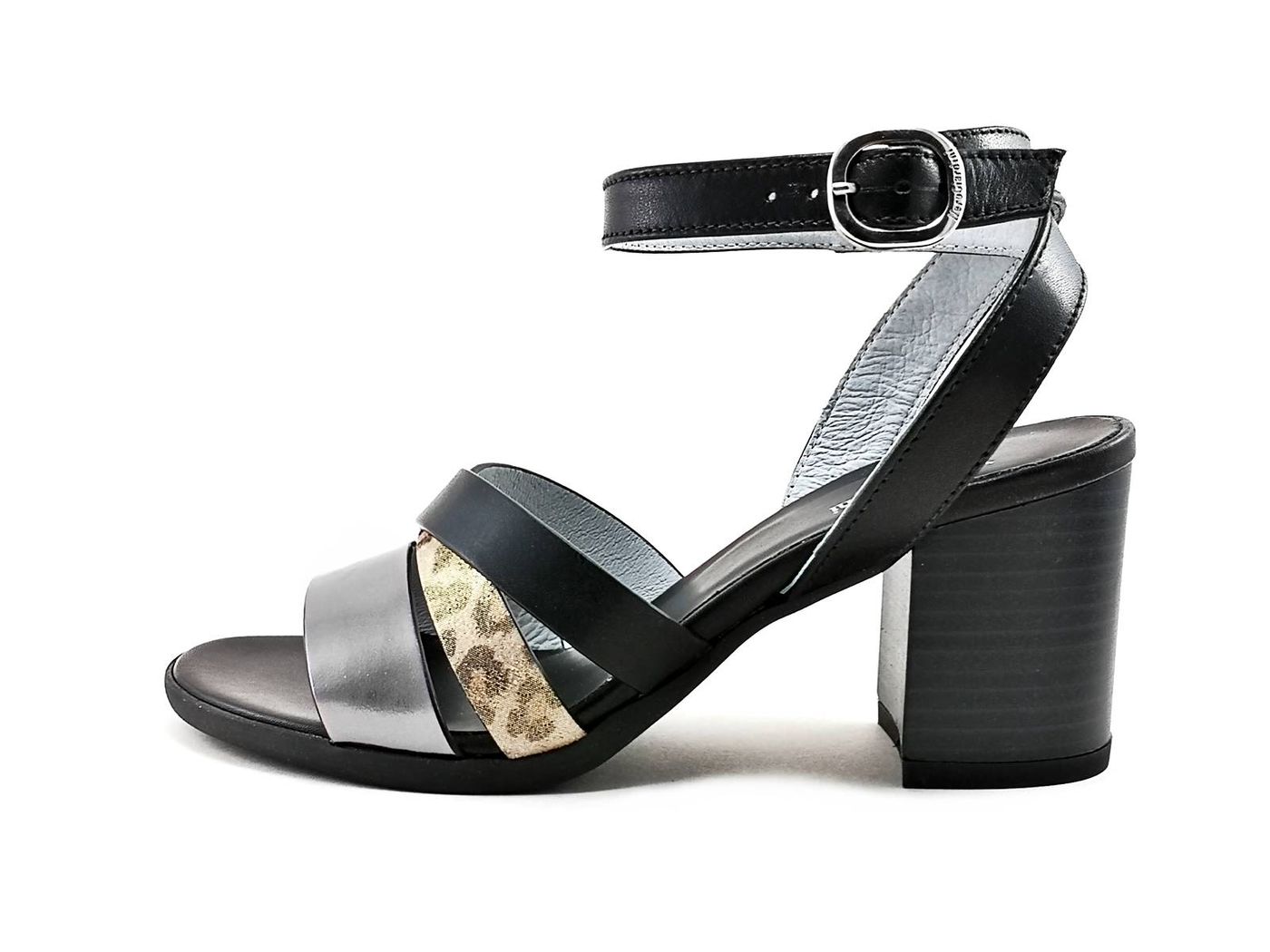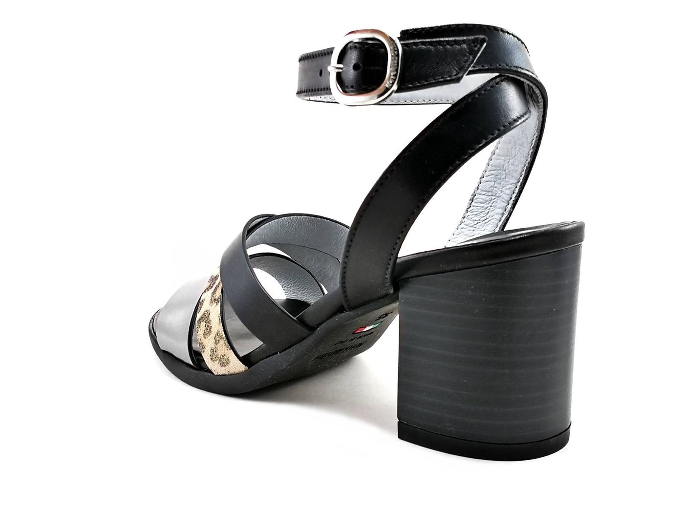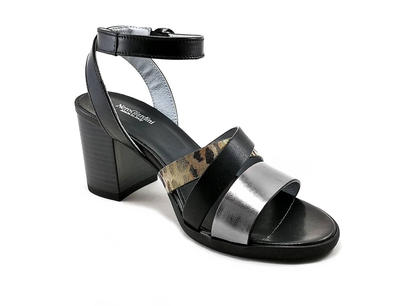 Sandali con tacco largo NeroGiardini E218651D - Sandali in pelle con listini incrociati mirror e animalier glitterato, fodera in pelle, tacco a blocco di 7 cm. Suola in gommina antiscivolo. Made in Italy.