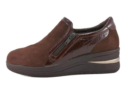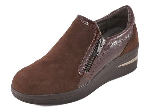 Sneakers donna in pelle scamosciata testa di moro con zeppa leggera, zip ed elastico. Comode, eleganti e pratiche per ogni giorno.